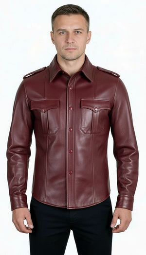 This Mens Maroon Leather Uniform Shirt is for the man who wants something distinctive but still refined. The deep maroon tone adds character while the clean uniform styling keeps it sharp and structured.