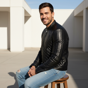 Discover the perfect blend of style and comfort with our Black Quilted Leather Moto Jacket. Handcrafted by Pakistani artisans with over 50 years of experience, this 100% genuine sheepskin leather jacket showcases an exquisite chevron quilting.